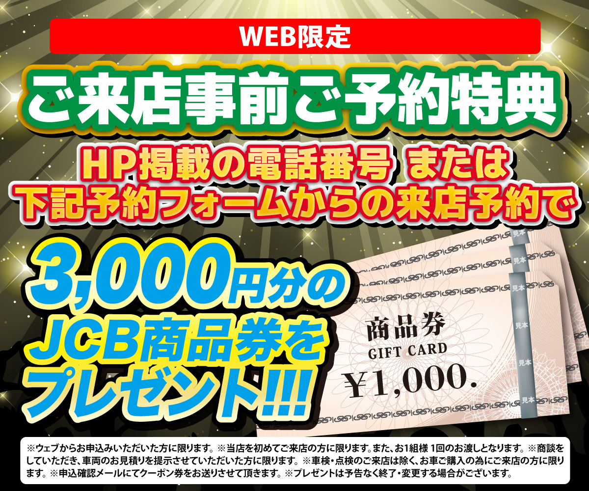 ※お車購入ご検討の方はWEBから来店ご予約下さい。※事前WEB来店ご予約でJCBギフトカード3,000円プレゼント!!